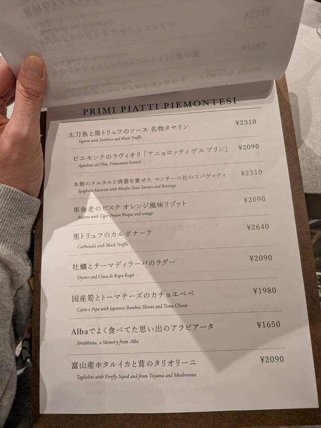 魅力的なプリモのラインナップ。普通に考えたら「名物」とつく「太刀魚と黒トリュフのソース 名物タヤリン」にいきそうだが、「車海老のビスク オレンジ風味リゾット」はオレンジとエビ、同系色同士の素材の組み合わせにセンスを感じる。「国産筍とトーマチーズのカチョエペペ」はカチョエペペ好きとしてとても気になる……しかし、意外と「Albaでよく食べてた思い出のアラビアータ」が一番美味しかったりする……と、いい意味でどれにするか考え込んでしまう