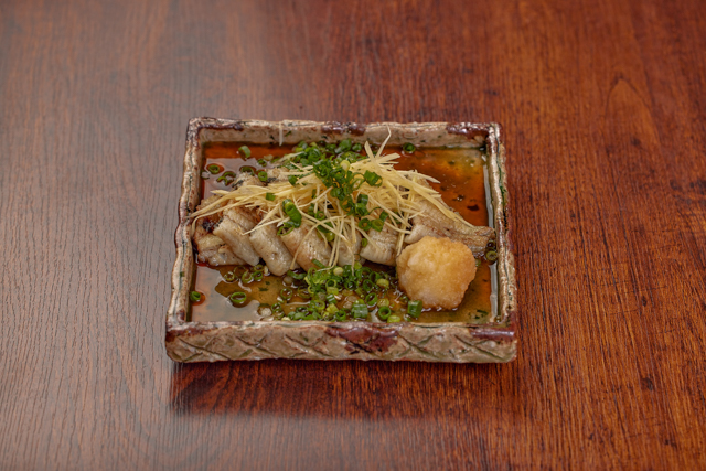 珍しい、うなぎの「たたき」。しっかりと焼き上げたうなぎを、ショウガとネギでさっぱりといただく。暑い夏には食欲をそそりそうだ。こちらも「新宿うな鐵」定番の人気メニュー