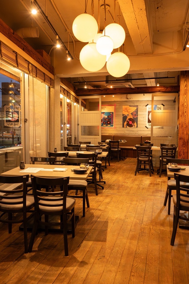 店内は約30坪43席。奥にキッチンを配置し、テーブル席とカウンター席に加え、パーテーションで半個室として利用できるスペースも備え、多様な利用シーンに対応する。内装は基礎造作を残したまま、壁や椅子の色を塗り替え、電球やアート作品を取り入れることで、カジュアルで温かみのある空間に仕上げた