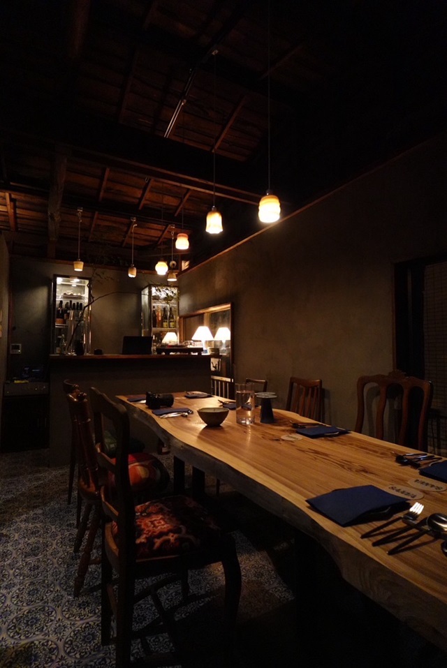 2階は一枚板のテーブルを中心に構成し、物件の構造を活かして一段高く設けたカップル席も配置。古民家の造作を活かし、温もりを感じる空間に仕上げている。照明で色気を演出したカウンターには、座面の柄が異なる1940年代の椅子を採用。床には焼き物のタイルを敷き詰め、作家物のランプシェードや食器を揃えるなど、「本物を使うことを意識している」と曽我氏は語る