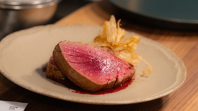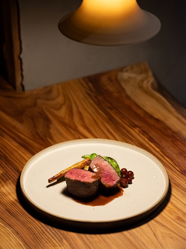 また、直接生産者や販売者のもとに足を運び、自分たちの店づくりの思いに呼応するストーリー性や熱意を感じた食材を厳選し、独自の表現でメニューに落とし込んでいるのも特徴だ。例えば、石司の生本鮪は、刺身ではなくあえて焼き上げて「石司 生本鮪のポワレ ラズベリー醤油」(4400円)として提供。ラズベリーの酸味に、燻製香をまとった生クリーム、黒胡椒、ごぼうチップスと複層的な風味を構築しながら、鮪の旨みを最大限に引き立てた一皿だ。