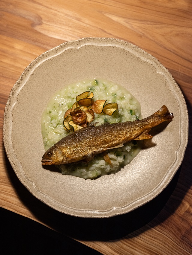 「鮎とズッキーニのリゾット」(1980円)。鮎を丸ごとコンフィにし、骨まで柔らかく仕上げた一皿。鮎のワタのほろ苦さがアクセントとなり、味に奥行きを与える。ベースにはきゅうりとズッキーニを用い、夏の瑞々しさを表現。使用する食材は季節に応じて変化する