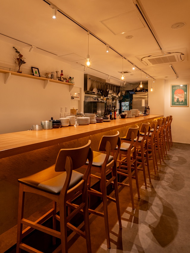 約27坪33席。1階にオープンキッチンのカウンター席、2階にはテーブル席と個室を備え、多様な利用シーンに対応する。全体を見渡せるカウンターを軸に、調理の臨場感と自然な会話が生まれるライブ感を意識した空間設計を採用。「肩ひじ張らずに、ちょっと贅沢な日常を楽しんでもらえる場所」を目指し、白とグレー、木を基調とした明るくて爽やかな内装に仕上げている