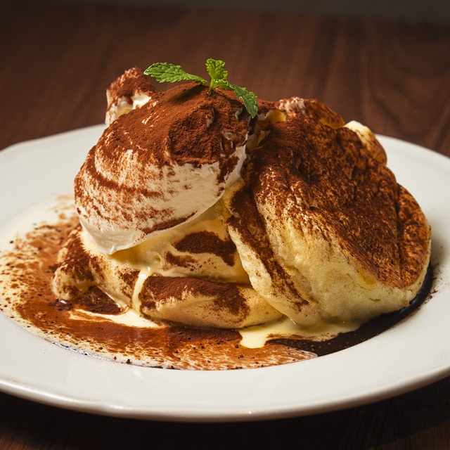 「レアチーズティラミスのスフレパンケーキ」(1859円)。パンケーキはメレンゲを使ったふわふわの食感で、食後でもぺろりと食べられる