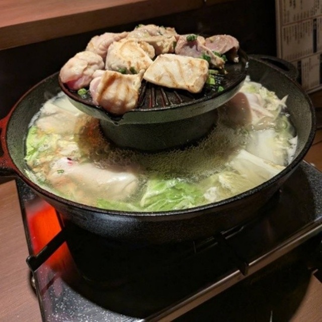 「にんにく鶏焼肉サン」はただの鶏焼肉ではない。まず特徴的なのが肉を焼く鉄鍋だ。二段構造になっており、上部で鶏肉を焼き、下部には白菜とともにスープが煮えている。上部で焼いた鶏肉の油がスープに滴り落ち、だんだんとスープが「育っていく」楽しさが味わえる。最後はこのスープに麺や雑炊を入れて〆るという趣向で、いわば“体験型”の飲食だ。「思い思いにスープ育てる楽しみがあり、やがて常連になれば自分の“スープ育成の流儀”を持つようになる。それを披露するために人を連れてきて…という具合にお客様が増えています」と吉野氏。