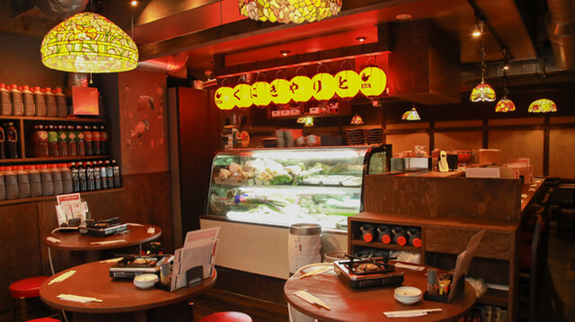 「にんにく鶏焼肉サン 学芸大学」の内観。テーブル席のほか、カウンター席もある。レトロ調のランプシェードをアクセントにしたどこか懐かしい雰囲気の店内。BGMは昭和歌謡を流す