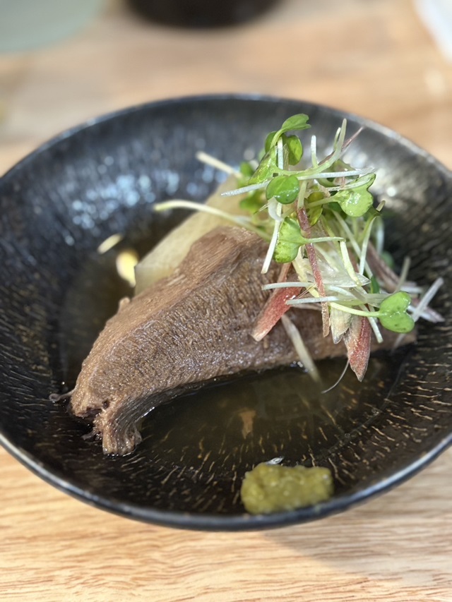 看板メニュー「牛タン煮込み」。高級食材の牛タンを惜しまず使い、店の顔として強い印象を残す一皿