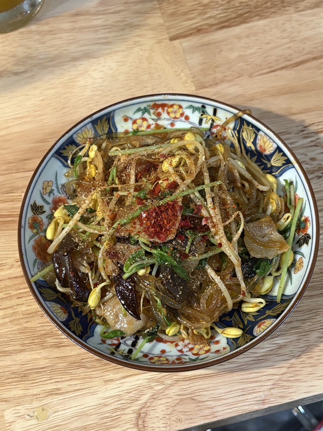 メニューには、「たまごチャーハン」(650円)や「ピリ辛青唐チャーハン」(750円)、「広島辛麺焼きそば」(700円)などの炒め物が並ぶ。 一方で、「お刺身と京九条ねぎの和風カルパッチョ」(700円)といった鮮魚を使った一品や、「ピーマン肉詰め…焼かない」(2個500円)といった、“炒め物”を逆手に取ったユニークなつまみも用意する。 名物は「牛タン煮込み」(600円)と「焼き麻辣坦」(550円)。「あんぽんたん」とメニューの重複は一切なく、季節や客の反応に応じて今後もメニューを入れ替えていくという。