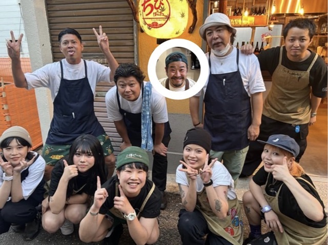 写真左上から、オーナー・梶田雅之氏、料理長・山根勇太氏。円で囲われているのが店長・古賀隆太郎氏(通称boboさん)、「あんぽんたん」含めたスタッフのみなさんと