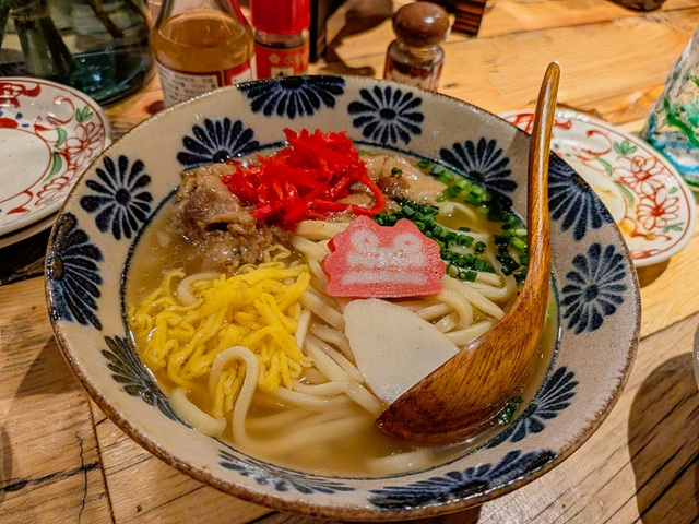 「ソーキそば」(900円/小650円)。ソーキそばの出汁は、カツオ出汁をしっかり効かせ、ラフテーなどで仕込んだ豚の煮汁と合わせ、二つの旨みを掛け合わせている