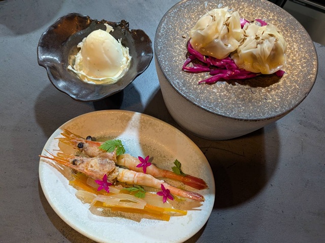 左上から時計回りに「半熟卵のトリュフウフマヨ」、「スパイスラムの焼売」(770円)、「甘エビのエスカベッシュ」(693円)