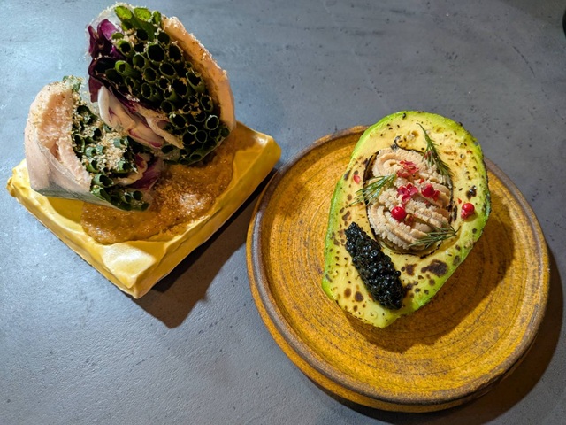 左から「鶏むね肉の生春巻き ゴマ味噌マヨネーズ」、「焼アボカドとキャビア」(715円)、