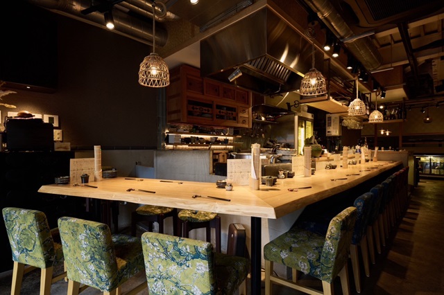 12.6坪30席。オープンカウンターを中心に、奥には収納スペースを確保するために作り出した小上がりのテーブル席も。和柄の椅子や木を基調とした内装で、落ち着きのある和モダンな大人の空間。カウンター前には煮込み鍋や火鉢がおかれ、目の前で調理が進むライブ感も魅力のひとつ。店名「笑“竹”杯」にちなみ、メニュー立てや網代、席の仕切りなど、随所に“竹”の意匠があしらわれている