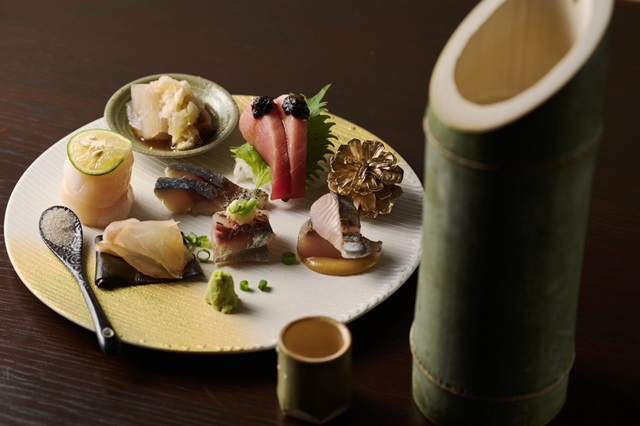 新鮮さが自慢の「お創り盛合」。鰹や太刀魚などの皮目を炭で炙ることで、香ばしい香りと豊かな味わいを引き出している。「刺身も一料理として楽しんでいただきたい」と語る齊藤氏の言葉通り、醤油ではなく魚ごとに合わせた自家製ダレで提供される
