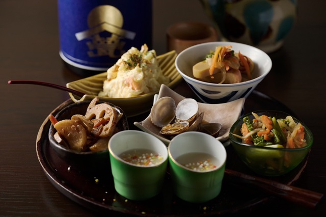 同店の“名刺代わり”として薦めたいというのが、おばんざい。「冬野菜のおひたし」「蟹味噌マカロニグラタン」「ねぎとろとアボカドのわさび和」など、旬の食材を使った月替わりの小皿料理が揃う。1~2名用の「梅」(880円)、2~3名用の「竹」(1480円)、4名以上の「松」(1880円)と人数に応じて選べるのもうれしいポイントだ。
