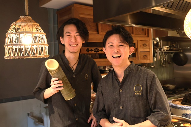 オーナーの齊藤竹史氏(右)と、店長の音羽克明氏(左)。店名「笑竹杯(しょうちくばい)」は、「笑って竹史と乾杯」との意味が込められ、齊藤氏の名前にも由来。「竹のように真っ直ぐ育ってほしい。そして、竹に節があるように、人生の節目ごとに自分の歴史を刻んでいってほしい」——そんな想いが込められた自身の名前に、幼少期は照れもあったが、今では誇りを感じているという