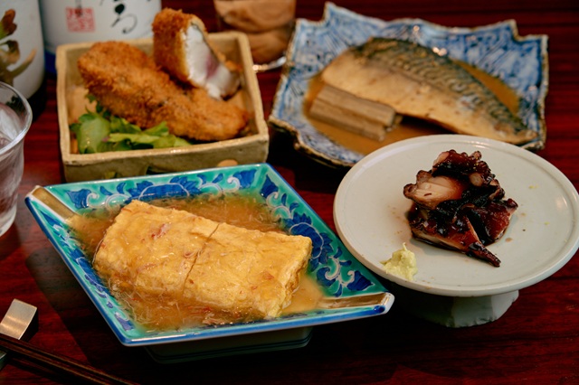 ランチ以外にも、夜は海鮮居酒屋として営業。高級店御用達の「やま幸」から仕入れるマグロをはじめ、豊洲や熊本・天草から仕入れる海鮮を使った一品料理が揃う。例えばは「イワシガリ巻」(1400円)、「九条ねぎと鮪のポテサラ」(700円)、「タコ柔らか煮」(1600円)、「蟹だし巻き」(1800円)など。ランチの焼魚は単品(各種1600円~)として用意し、「羽釜ごはん」(みそ汁、漬物付き1100円)を追加することで定食としても楽しめる。
