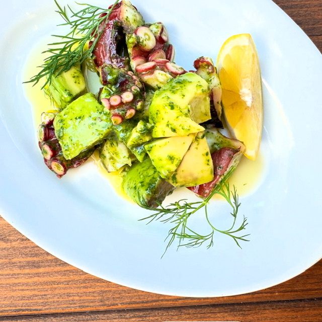 人気の前菜「タコとアボカド バジルソース」。香り豊かなバジルソースが絡み、お酒が進む一皿に仕上げている