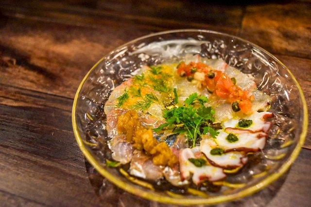 「4種のカルパッチョ」。真鯛にトマトケッパー、鯵に焼き茄子、平目にディル、水蛸にバジルソースと、鮮魚それぞれに相性の良いソースを合わせて仕立てている、見た目にも美しい一皿