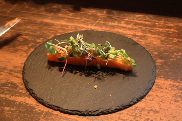 「スモークサーモンと東京江戸前ハーブ、世田谷柚子」(1400円)は、東京産の江戸前マイクロハーブと、世田谷産ゆずの皮で香りをまとわせた一皿。素材の繊細な香味が、サーモンの旨みを引き立てる