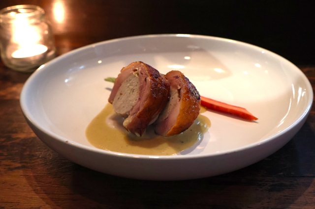「東京軍鶏のバロティーヌとフォアグラのソース」(4000円)。同店の料理は、食材選びへのこだわりに加え、火入れやソースの繊細さ、盛り付けの美しさまで心を奪われる。五感をくすぐる一皿が、食事の時間を豊かにしてくれる