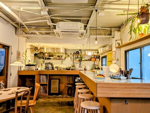 店名は、訪れる客にとっての「食卓」でありたいという思いを込めた。ワインと共に楽しむ料理を提供する「酒場」のスタイルを取る。内装は、「hugo」の温かみのある空間を生かしつつも「その日の気分や利用シーンで席を選べる空間」を意識してリニューアル。一角には一人でも楽しめるカウンター席を新設し、その横には「家のリビングのような」気分になれる特注のオーバル型のテーブルを置いた。窓際のベンチシートは大人数で楽しめる席で、板面をグレーにして落ち着いた雰囲気に仕上げた。京都や和光市のアンティークショップで購入した照明やイス、70年代のアンティークのスピーカーを加え、やわらかな光のランプを下げるなど、二人らしい空間に刷新。「時間を忘れて過ごせる空間」をつくりあげた。