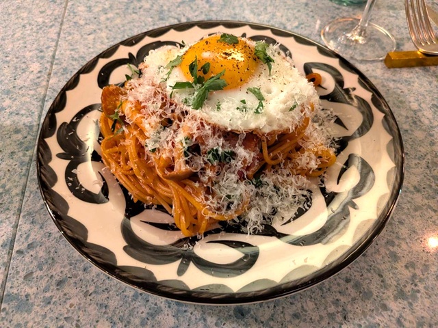 前菜からメイン、デザートまでひと通りが揃うメニューの中でも、特に客の心をつかんでいるのが「オムライス 牛すじトマト煮込み」(2200円)と「ナポリタン、目玉焼き」(1600円)。メニューを見て、前菜を選ぶ前に「絶対これ食べたい!」と宣言するお客も多いという。「まだ前菜も決めてないのに!」とツッコミが入るのを眺めるのが、渚氏のひそかな楽しみだとか。特にナポリタンは渚氏も惚れ込んでいた一品。ケチャップを少し焦がし、シナモンなどのスパイスや醤油を加えることで奥深さを生み出し、お酒を飲んだ後にぴったりな仕立てになっている。