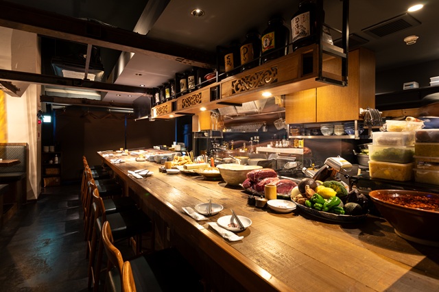 新宿三丁目駅近くの雑居ビル7階。以前は焼鳥居酒屋だった物件。焼き場を囲むカウンタ―席からテーブル席、個室風のボックス席もある