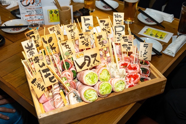 メニューは、既存の「ジョウモン」をベースに構成される。看板メニューの「野菜巻き串」を中心に、多彩な串焼きや一品料理が揃う。串は名物の「レタス巻き」(600円)を筆頭に30品以上。「おまかせ!!野菜巻き5串盛り」(1800円)も用意する。