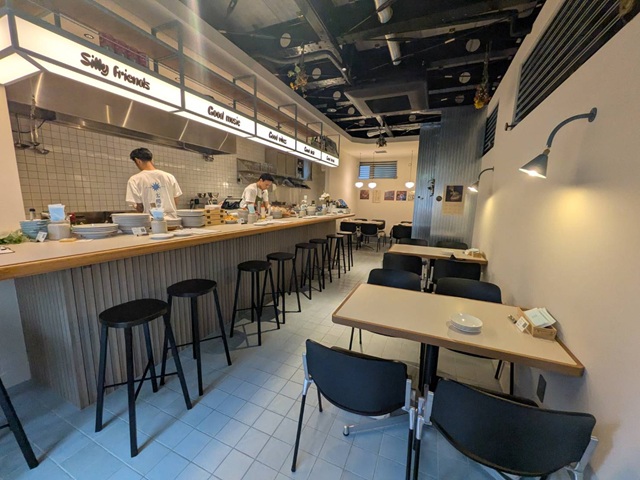 13坪24席の店内は、カウンターとテーブルを置く。床やタイルには淡いブルーをアクセントとして効果的に使っている