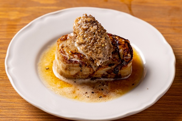 中でも青沼氏のスペシャリテが「里芋ステーキ 焦がしバター」(1000円)だ。里芋を一度潰してテリーヌ状に成形し、豚バラ肉を巻いて焼き上げる。そこに合わせるのは、焦がしバターと、キノコの旨味を凝縮したデュクセルソース。手間を惜しまず作られる一皿は、フレンチの真髄を感じさせる味わいだ。