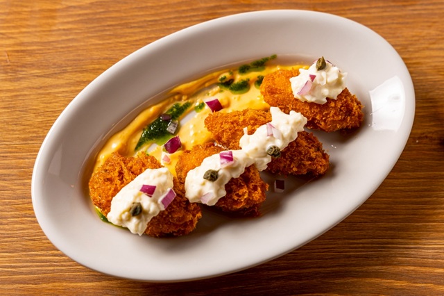 「牡蠣フライ 二種の特製タルタル」。定番のカキフライも、卵白と卵黄それぞれを使った2種のソースでオリジナリティある仕立てに