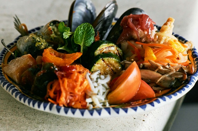 カウンター前のショーケースに並ぶ前菜を盛り付けた「HiBiの前菜12種盛合」