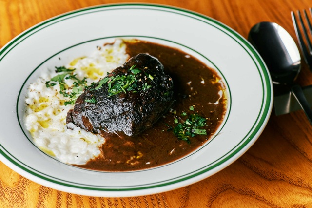 メイン料理の一つ、「牛ホホ肉赤ワイン煮込みとクリームリゾット」(3300円)。その名の通り2品をあいがけした一皿で、「最後、煮込みのソースとリゾットが混ざりあったところが美味しいんです」と當山氏