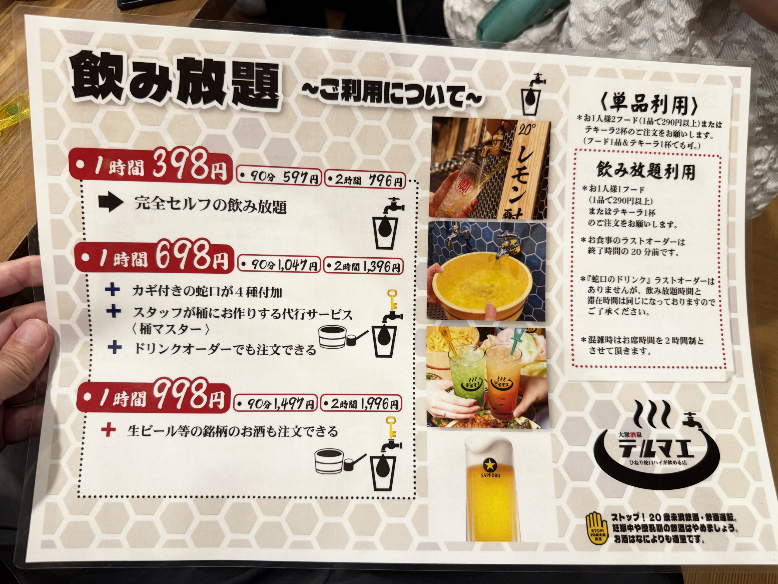 高橋さん:1時間、90分、2時間も選べます。398円だと完全セルフ。セルフ以上のプランは鍵付きの蛇口が捻れる。一番上のプランはビールとか銘柄のもの、八海山とかも全部飲み放題でついてますという感じです。