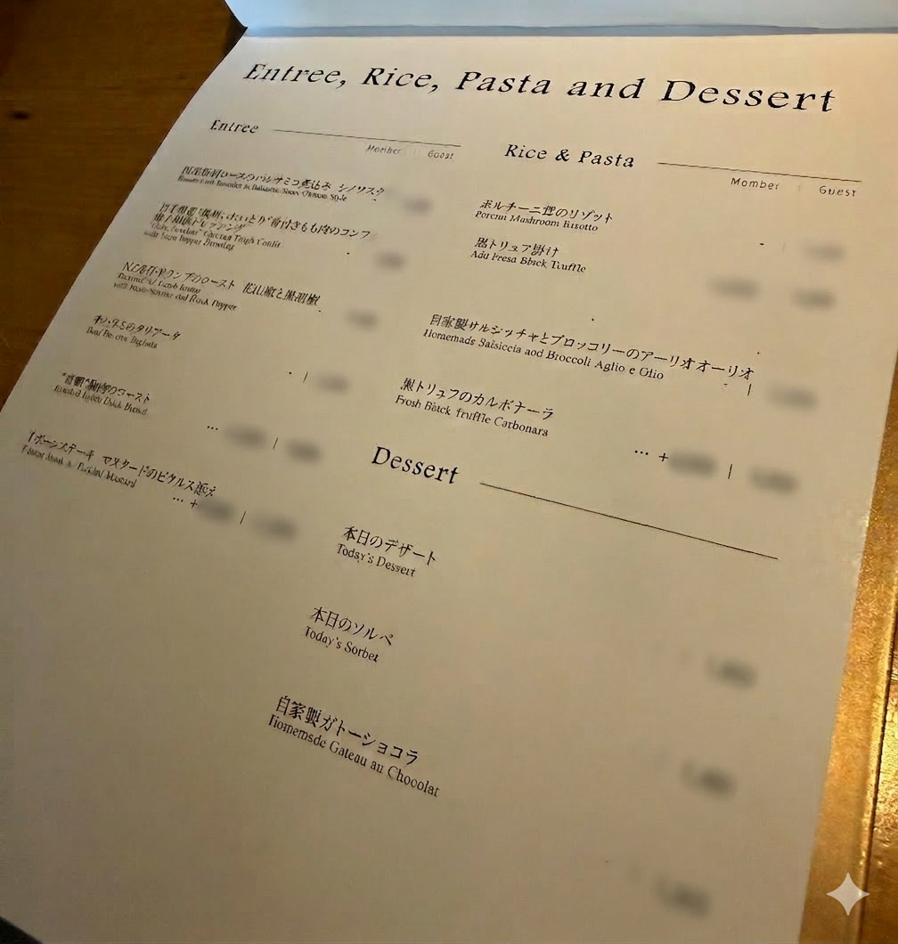 メンバー(会員)価格とゲスト価格があり、メンバーは+表記のメニューを除けば会費のみで全て食べ放題、飲み放題という画期的ないシステム。