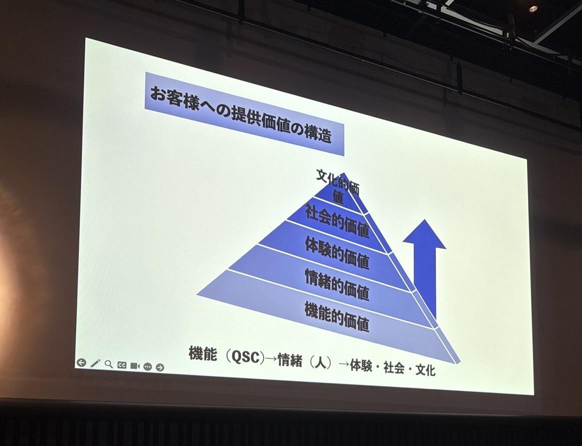 どれだけ社会的に意義のある取り組みをしていても、料理がまずく、接客が粗雑で、店内が不潔であれば、顧客はその店を選ばない。外食産業には、CSV経営の前提として、圧倒的な現場品質が求められる。狩野氏が示したのは「5つの価値の階層」だ。最も基底にあるのが「機能的価値」――QSC(クオリティ・サービス・クリーンネス)に代表される、飲食店としての基本的な品質だ。これを土台として、その上に「情緒的価値」が積み上がる。人と人との間に生まれる感情的なつながり、温かさ、居心地の良さといったものだ。さらに上には「体験的価値」がある。食事そのもの以外の、店に来ること全体の体験として記憶されるものだ。そしてその上に「社会的価値」が乗り、最終的に「文化的価値」へとつながっていく。